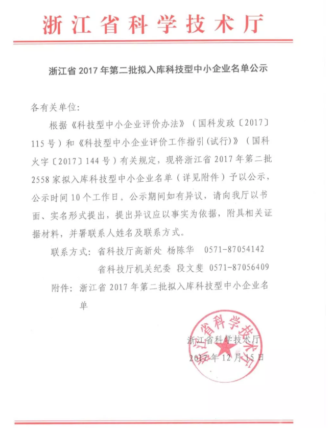 12月15日,杭州市科学技术委员会下发《关于认定2017年杭州市第二批浙江省科技型中小企业的通知》,公布了第二批浙江省科技型中小企业名单,德赢vwin体育名列其中。