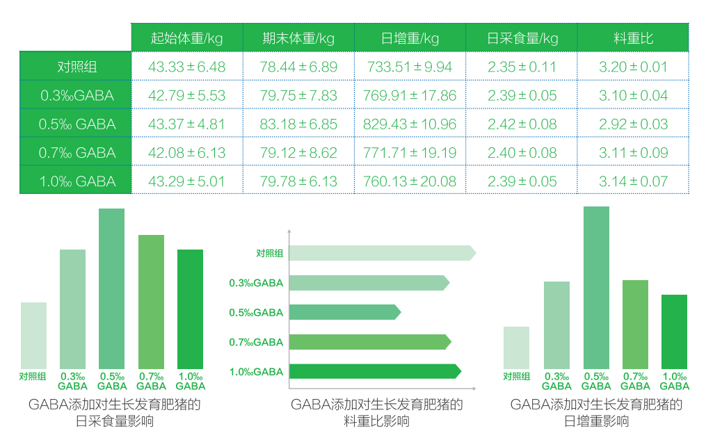 实验结果表明:GABA对发育猪有增重作用,日增重有明显的提高,采食量效果也有所提高,其中0.5%GABA添加水平效果较佳,与对照组相比,日增重和日采食量有明显提高,料比重显著降低。