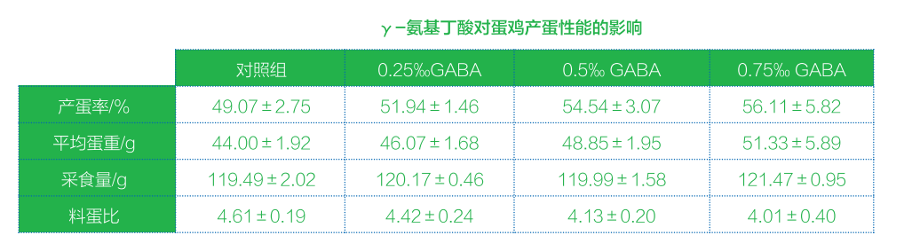 实验结果表明:GABA对蛋鸡产蛋性能有提升作用,产蛋率、平均蛋重有明显的提高,料蛋比明显下降,采食量有效果,但相对不明显,其中0.75%GABA添加水平效果较佳,与对照组相比,产蛋率、平均蛋重以及日采食量有明显提高,料比重显著降低。
