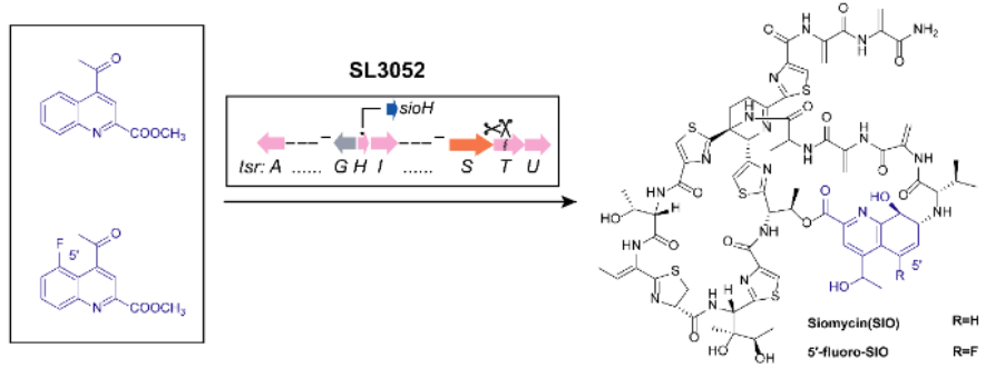 核糖体肽是一大类具有高度结构多样性和多种生物活性的天然产物,到目前为止已经发现了20多个不同的核糖体肽家族,其中硫肽类抗生素是研究人员投入精力研发最多的一类核糖体肽,如那西肽、硫链丝菌素、丝裂霉素等。丝裂霉素(Siomycin)是硫肽抗生素的重要代表,可有效拮抗多种革兰氏阳性细菌,并易被用作动物抗菌剂使用。