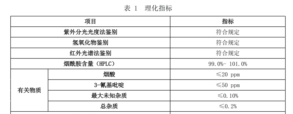德赢vwin体育的烟酰胺企业标准在各个维度尤其是烟酸类目,明显优于国家质量监督局发布的各项指标。