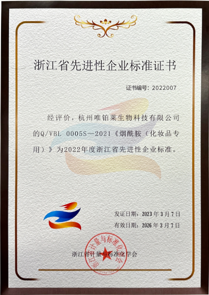 热烈庆祝德赢vwin体育《烟酰胺(化妆品专用)》被评为2022年浙江省先进性企业标准!日前,根据《国家标准化发展纲要》和《关于贯彻落实<国家标准化发展纲要>的实施意见》(浙委发〔2022〕11号)精神要求,浙江省计量与标准化学会在浙江省市场监管局的指导和监督下,经严格评审,授予17家企业的19项标准为2022年浙江省先进性团体标准、企业标准。德赢vwin体育《烟酰胺(化妆品专用)》名列其中。