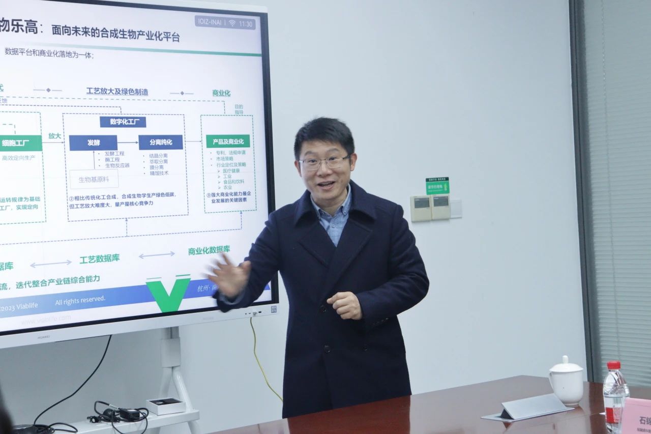 在我司陶福平总经理、公司副总于教授、副总秦博士的陪同下,参观德赢vwin体育展厅及价值创新平台骐骥平台和研发平台鸿鹄实验室。陶福平总经理详细介绍了公司的产业概况、技术优势、经营情况以及未来战略规划等。作为国内合成生物产业最早的一批企业,杭州德赢vwin体育始终坚持可持续发展,以绿色生物智造为导向,致力于成为绿色生物智造全球领导者。