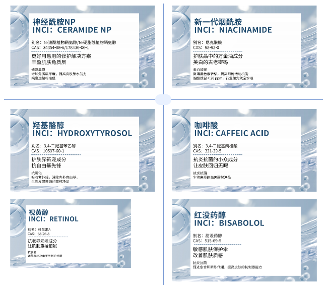 产品:神经酰胺NP、新一代烟酰胺、羟基酪醇、咖啡酸、视黄醇、α-红没药醇