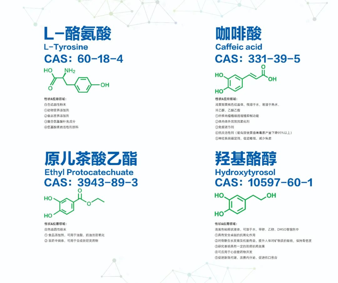 产品:原儿茶酸、烟酰胺、L-酪氨酸等