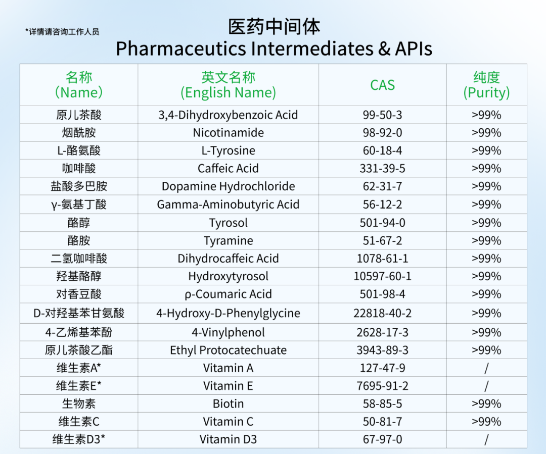 产品:原儿茶酸、烟酰胺、L-酪氨酸、咖啡酸等