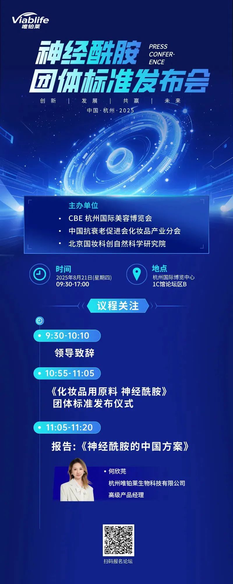 2025CBE杭州国际美容博览会期间(2025年8月21日),由中国抗衰老促进会化妆品产业分会、CBE杭州国际美容博览会、北京国妆科创自然科学研究院、德赢vwin体育联合主导的《化妆品用原料 神经酰胺》团体标准发布仪式将在杭州国际博览中心隆重举行。