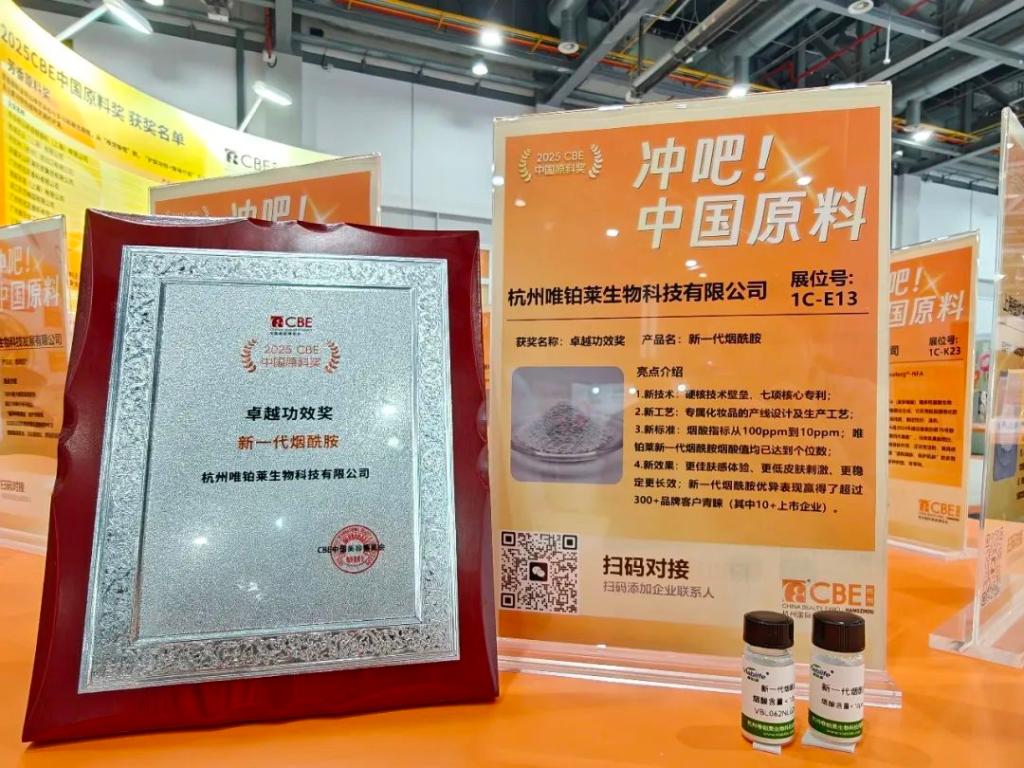 作为CBE展会常年亮点,中国原料获奖展区一直是观众瞩目的焦点。德赢vwin体育本次荣耀上榜,重磅产品新一代烟酰胺及相关专利技术展示将落位1C馆获奖展区,带来行业前沿创新成果分享。